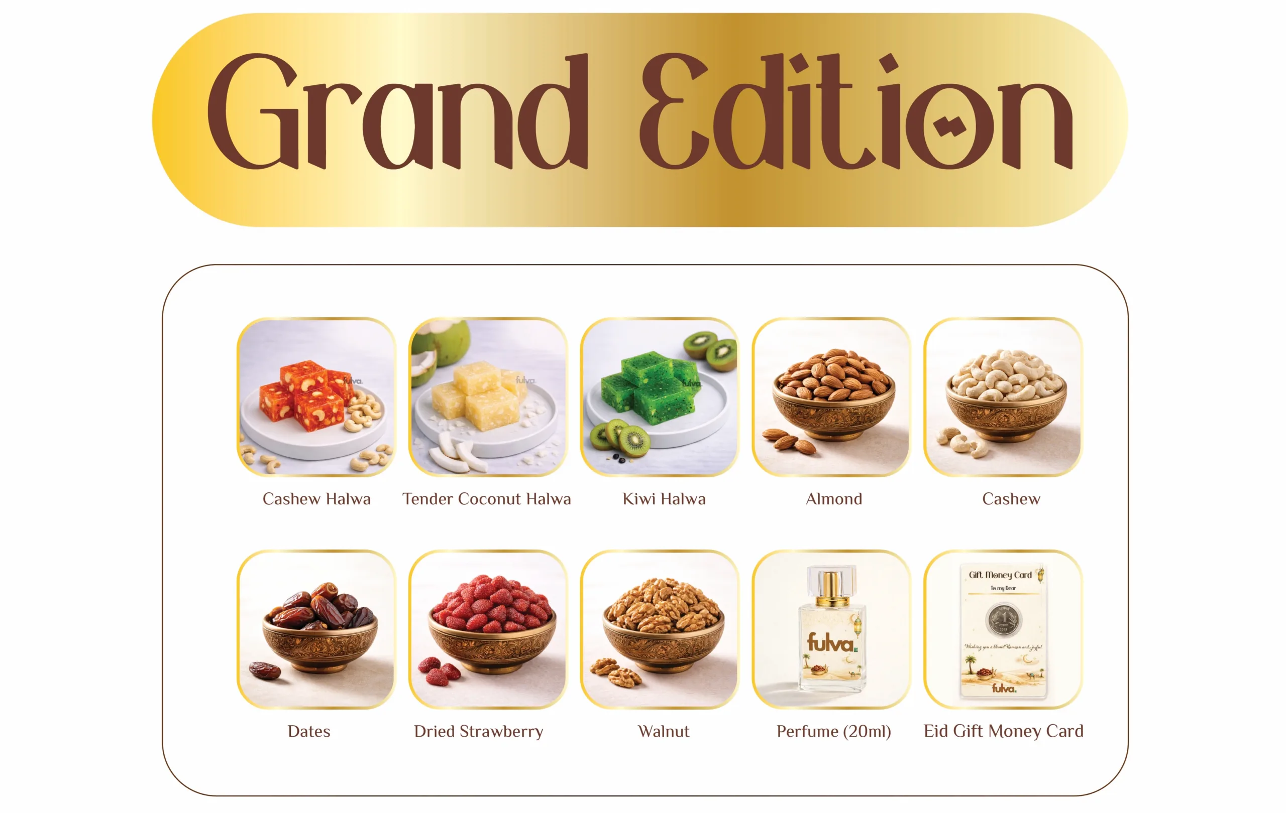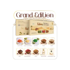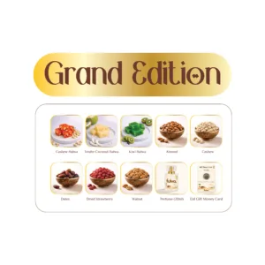 To complement the sweets, the box includes a selection of high-quality dry fruits and nuts: raw Almonds, Cashews, Walnuts, Dates, and Dried Strawberries. Each Grand Edition also comes with a 20ml premium perfume and an Eid Money Card (Greeting Card), making it a complete and thoughtful festive hamper. I’t is a well-curated choice for those who appreciate variety and luxury.