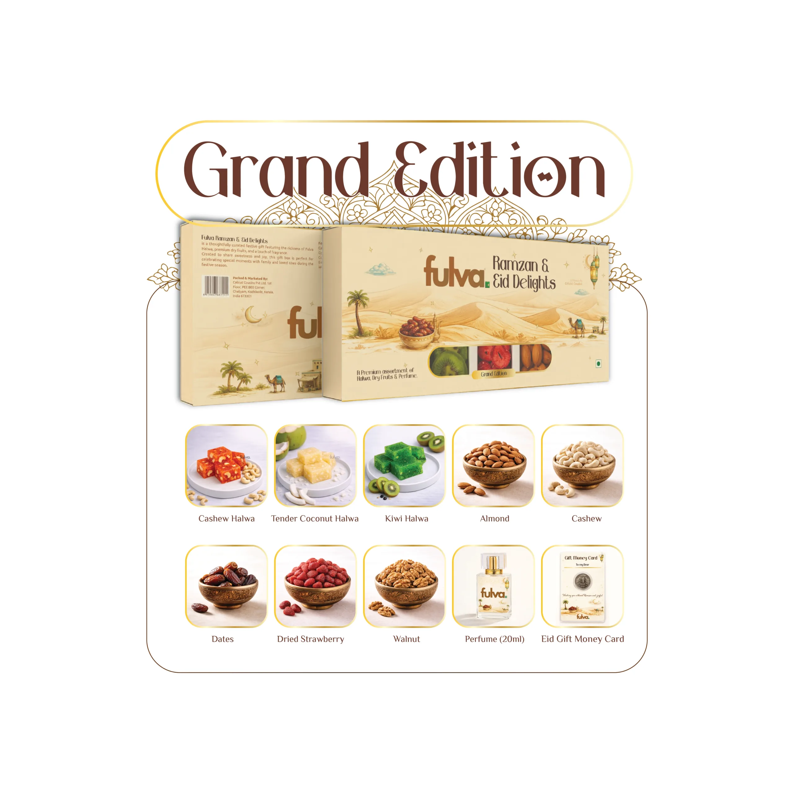 The Grand Edition from the Fulva Ramzan & Eid Delights collection is a premium gifting option designed for your loved ones. This assortment features a rich variety of authentic Kozhikoden halwa, including Cashew halwa, Tender Coconut halwa, and the exotic Kiwi halwa.